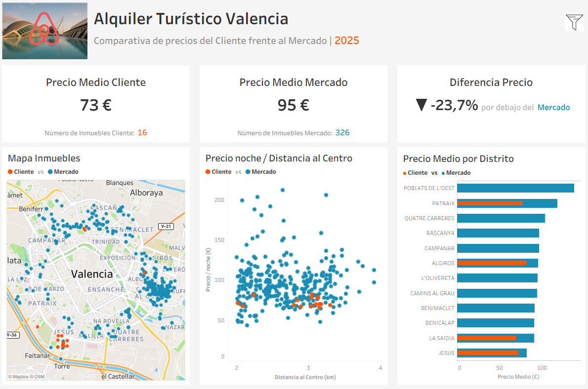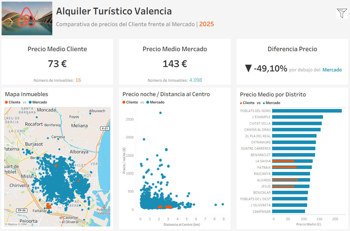 ESTUDIO DE POSICIONAMIENTO Y PRECIOS TURÍSTICOSDurante el desarrollo de mi formación en Data Analytics quise realizar un proyecto que simulase un encargo real de una empresa del sector turístico.El objetivo era analizar el mercado de alquiler turístico en Valencia para un cliente ficticio con 16 inmuebles y determinar su posicionamiento frente a la competencia a partir de datos públicos de Airbnb.El proyecto se planteó como un estudio de mercado completo: desde la exploración y limpieza de datos hasta la creación de un dashboard interactivo en Tableau, capaz de responder preguntas de negocio sobre precios, rentabilidad y localización.