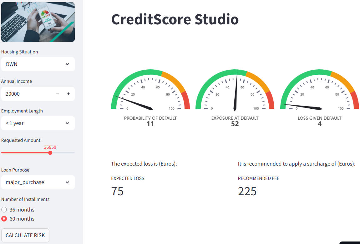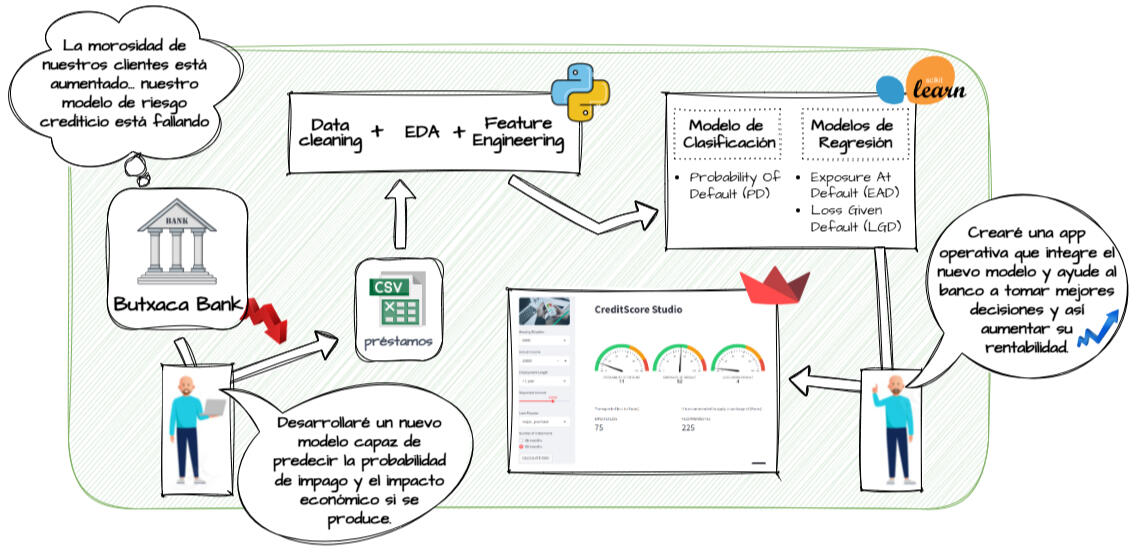 • Un aumento de la morosidad en una entidad financiera puede deberse a varios factores, pero uno de ellos es una mala gestión del riesgo crediticio a la hora de conceder préstamos al consumo.• Como ocurrió durante la crisis de 2008, una inadecuada evaluación del riesgo puede poner en peligro la estabilidad de un banco, por lo que disponer de una herramienta robusta de análisis y modelización es fundamental.• Para abordar este reto, apliqué técnicas de calidad de datos y realicé un análisis exploratorio (EDA) utilizando la librería Pandas.• Con Pandas y NumPy definí las variables objetivo necesarias para los modelos y apliqué técnicas de transformación de datos (One-Hot Encoding, binarización, reescalado y consolidación de los datasets).• Para modelizar la Probability of Default (PD), utilicé Scikit-learn con un enfoque de clasificación mediante Regresión Logística, construyendo un pipeline completo con optimización de hiperparámetros, validación cruzada y evaluación mediante ROC-AUC.• Posteriormente, desarrollé los modelos de Exposure at Default (EAD) y Loss Given Default (LGD) mediante técnicas de regresión, utilizando HistGradientBoostingRegressor (equivalente a LightGBM en Scikit-learn) y replicando la misma metodología de optimización y validación.• Finalmente, preparé el código de reentrenamiento y el código de ejecución, que integré en CreditScore Studio, una aplicación construida con Streamlit diseñada para ayudar al banco en la toma de decisiones al otorgar nuevos créditos al consumo.