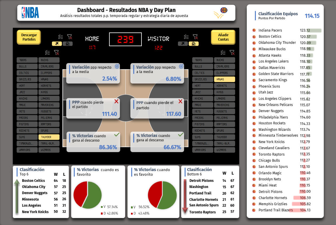 DASHBOARD NBADurante la temporada 2023-2024 de la NBA quise crear un sistema que no solo actualizara automáticamente los resultados de los partidos, sino que también sirviera como herramienta de apoyo en la toma de decisiones para apuestas deportivas.